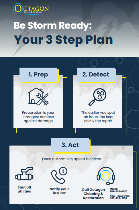 In New England, storms bring more than just rain—they bring risk. Heavy winds, sudden flooding, and hidden water damage can threaten your property if you’re not prepared. The best protection isn’t reacting after the fact—it’s having a plan in place. That’s why Octagon Cleaning & Restoration recommends a simple 3-step approach: Prep, Detect, and Act.